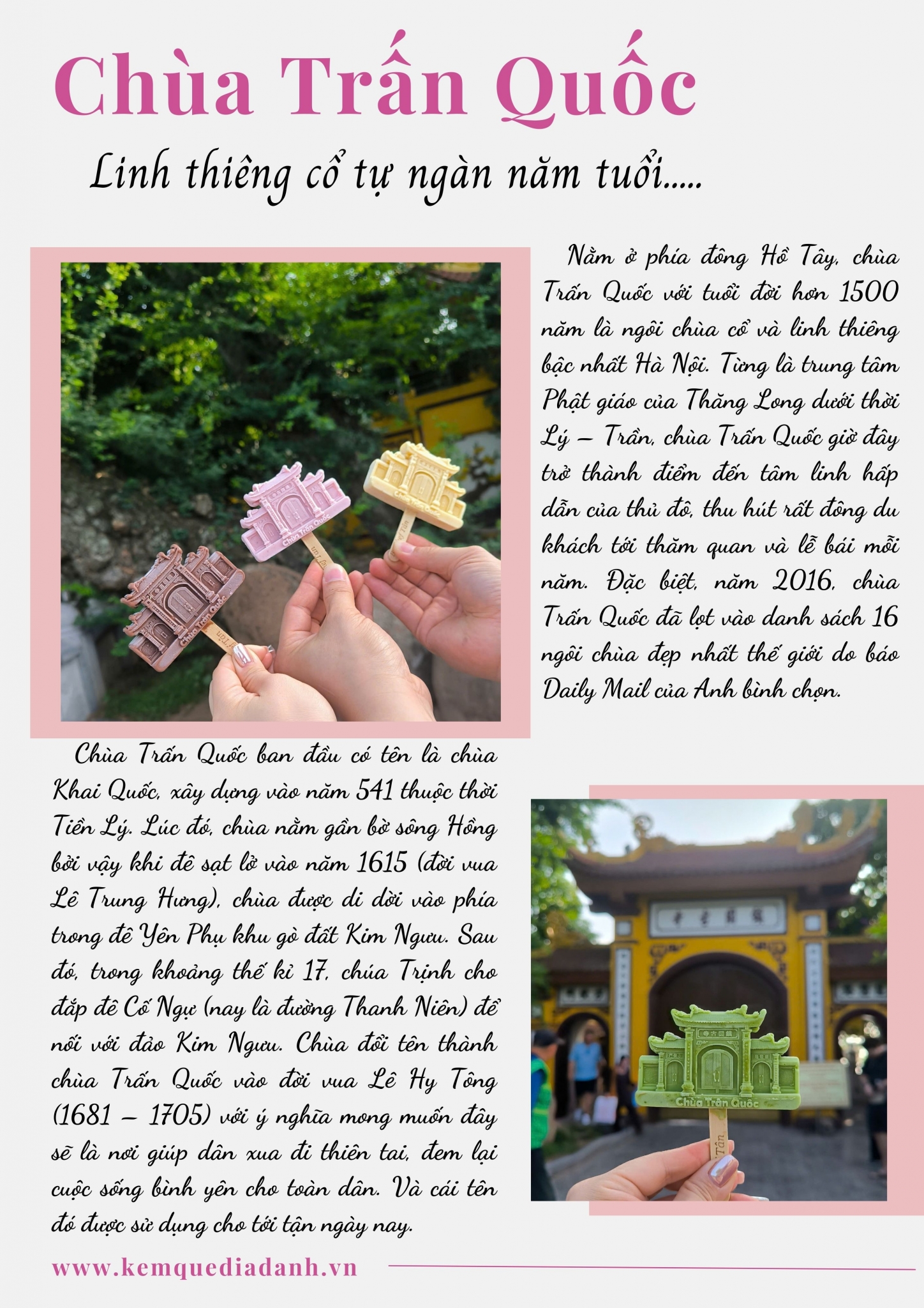 Nằm ở phía đông Hồ Tây, chùa Trấn Quốc với tuổi đời hơn 1500 năm là ngôi chùa cổ và linh thiêng bậc nhất Hà Nội. Từng là trung tâm Phật giáo của Thăng Long dưới thời Lý – Trần, chùa Trấn Quốc giờ đây trở thành điểm đến tâm linh hấp dẫn của thủ đô, thu hút rất đông du khách tới thăm quan và lễ bái mỗi năm. Đặc biệt, năm 2016, chùa Trấn Quốc đã lọt vào danh sách 16 ngôi chùa đẹp nhất thế giới do báo Daily Mail của Anh bình chọn.