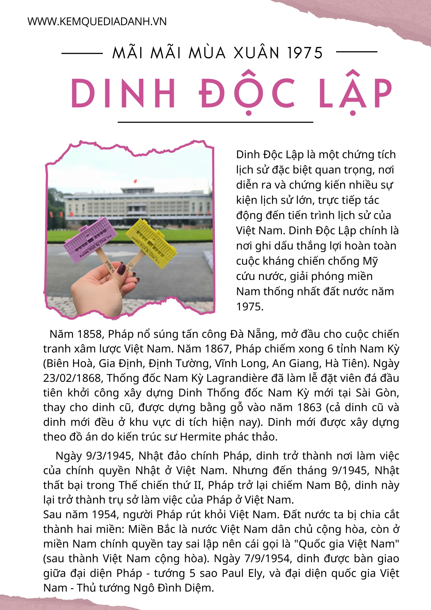 Dinh Độc Lập là một chứng tích lịch sử đặc biệt quan trọng, nơi diễn ra và chứng kiến nhiều sự kiện lịch sử lớn, trực tiếp tác động đến tiến trình lịch sử của Việt Nam. Dinh Độc Lập chính là nơi ghi dấu thắng lợi hoàn toàn cuộc kháng chiến chống Mỹ cứu nước, giải phóng miền Nam thống nhất đất nước năm 1975.