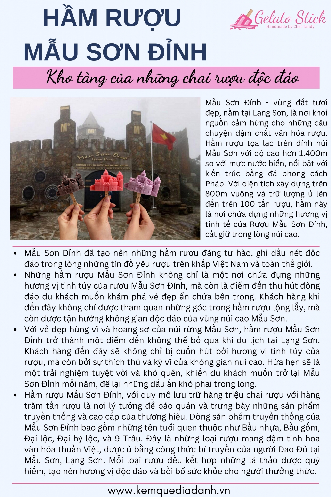 Mẫu Sơn Đỉnh vùng đất tươi đẹp, nằm tại Lạng Sơn, là nơi khơi nguồn cảm hứng cho những câu chuyện đậm chất văn hóa rượu. Hầm rượu tọa lạc trên đỉnh núi Mẫu Sơn với độ cao hơn 1.400m so với mực nước biển, nổi bật với kiến trúc bằng đá phong cách Pháp. Với diện tích xây dựng trên 800m vuông và trữ lượng ủ lên đến trên 100 tấn rượu, hầm này là nơi chứa đựng những hương vị tinh tế của Rượu Mẫu Sơn Đỉnh, cất giữ trong lòng núi cao.