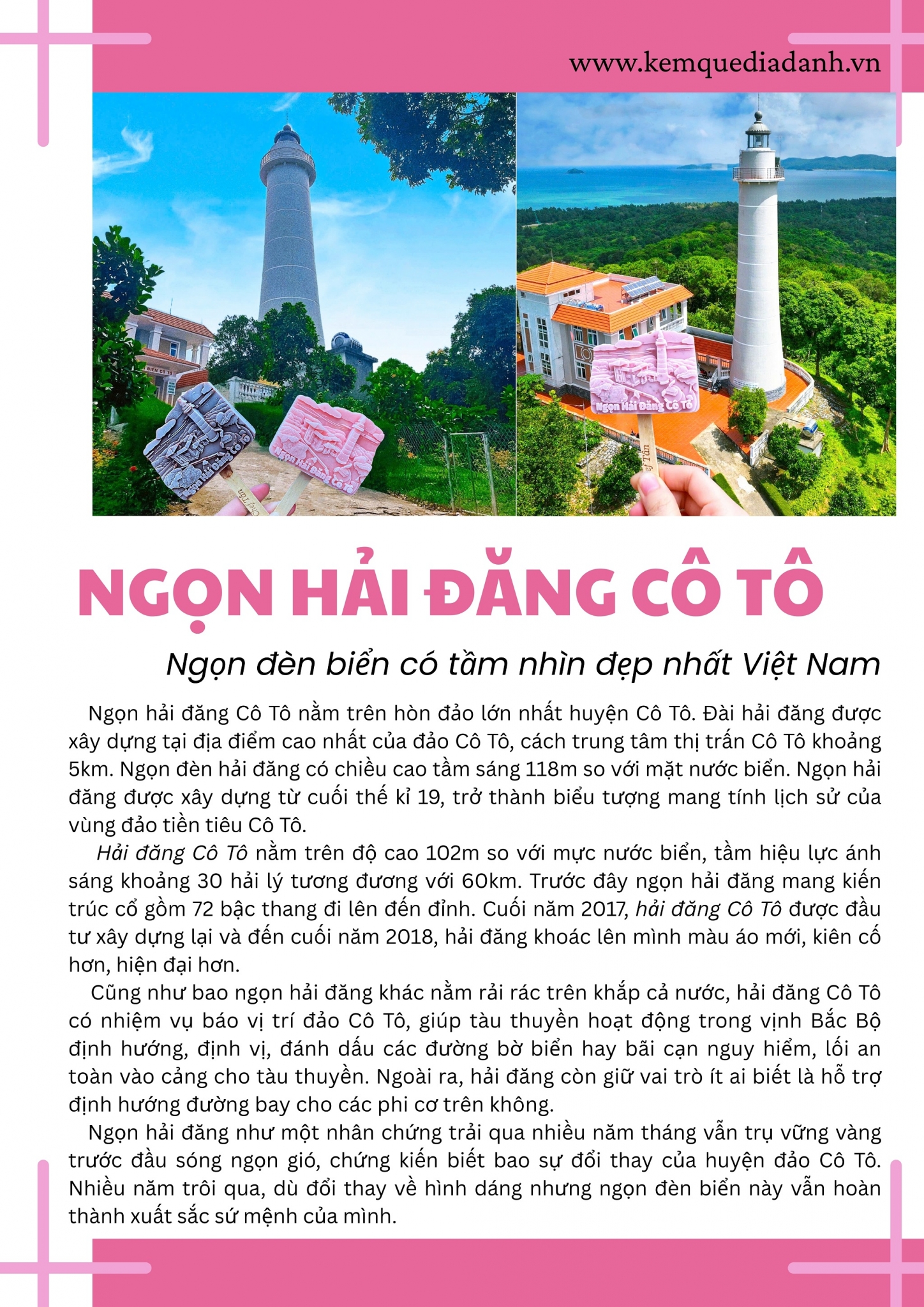Ngọn hải đăng Cô Tô nằm trên hòn đảo lớn nhất huyện Cô Tô. Đài hải đăng được xây dựng tại địa điểm cao nhất của đảo Cô Tô, cách trung tâm thị trấn Cô Tô khoảng 5km. Ngọn đèn hải đăng có chiều cao tầm sáng 118m so với mặt nước biển. Ngọn hải đăng được xây dựng từ cuối thế kỉ 19, trở thành biểu tượng mang tính lịch sử của vùng đảo tiền tiêu Cô Tô.