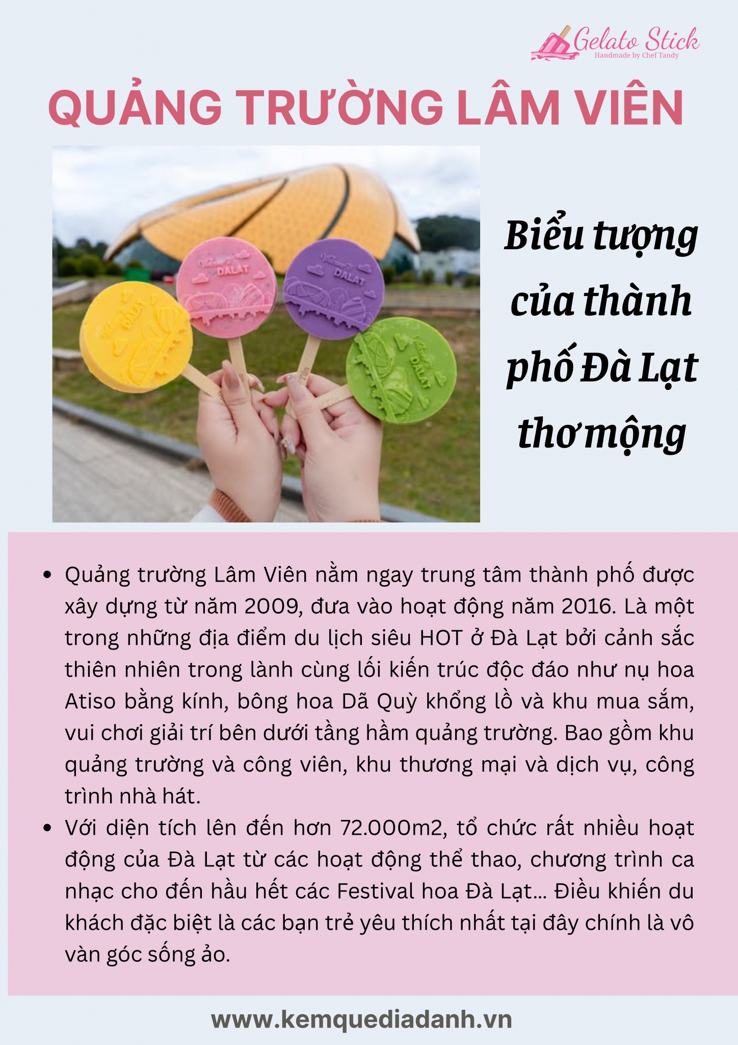 - Quảng trường Lâm Viên nằm ngay trung tâm thành phố được xây dựng từ năm 2009, đưa vào hoạt động năm 2016. Là một trong những địa điểm du lịch siêu HOT ở Đà Lạt bởi cảnh sắc thiên nhiên trong lành cùng lối kiến trúc độc đáo như nụ hoa Atiso bằng kính, bông hoa Dã Quỳ khổng lồ và khu mua sắm, vui chơi giải trí bên dưới tầng hầm quảng trường. Bao gồm khu quảng trường và công viên, khu thương mại và dịch vụ, công trình nhà hát.