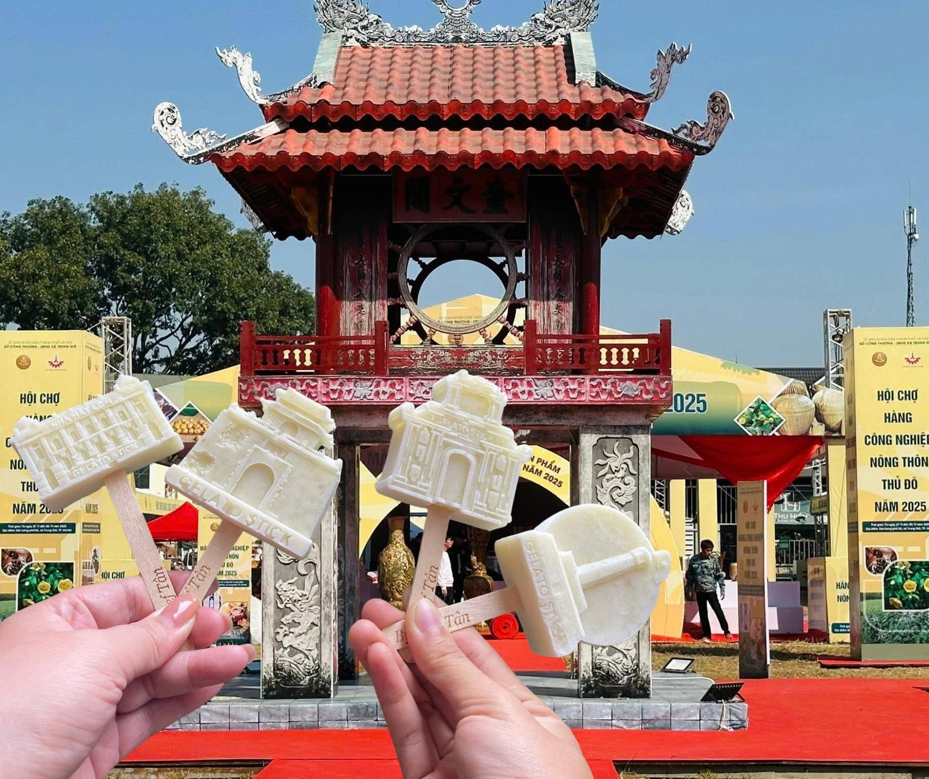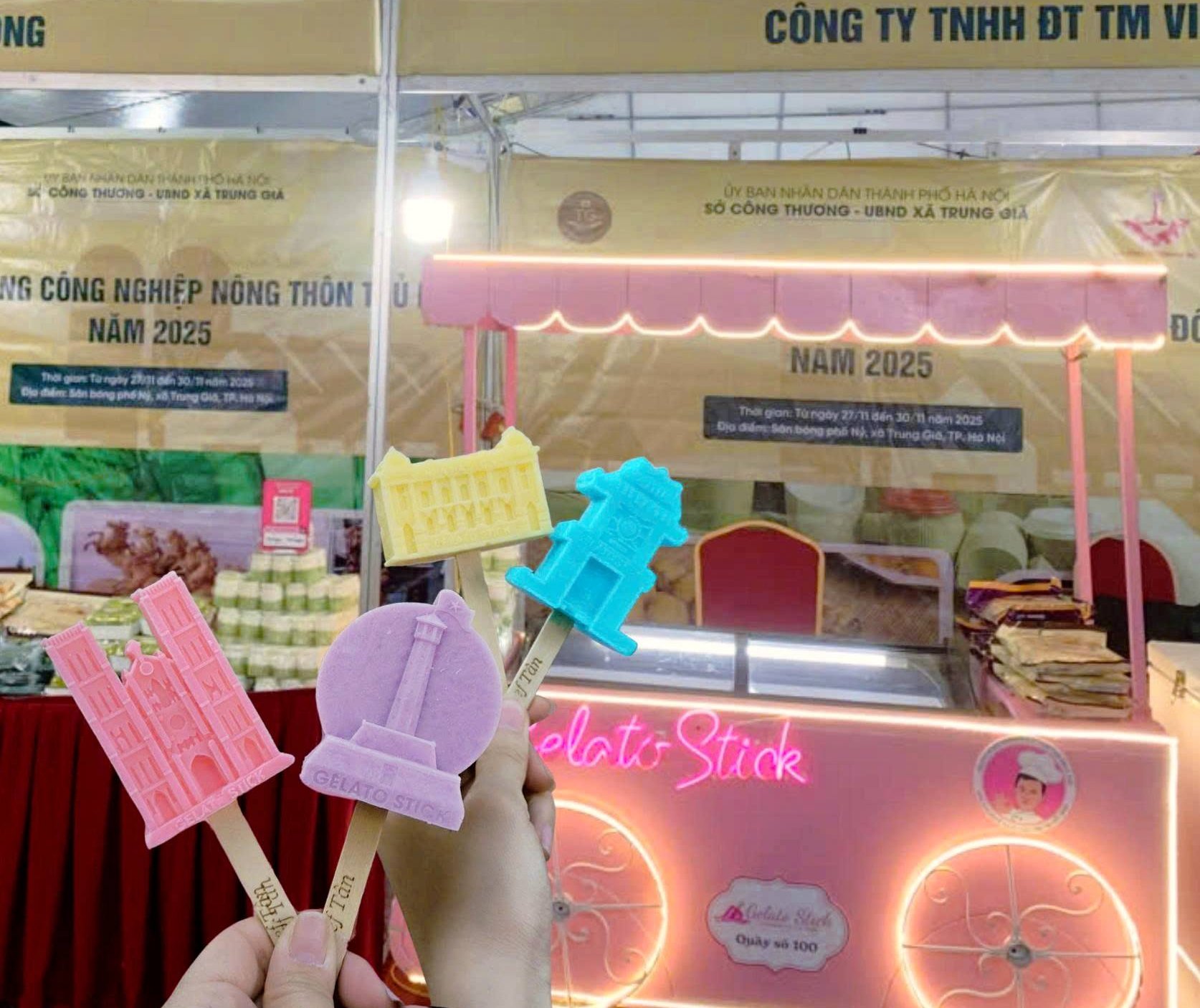 Và đặc biệt hơn cả, năm nay gian hàng gửi đến khách tham quan một “món quà” rất mới: Kem Cốm Mộc Huyền x Gelato Stick – sự hòa quyện giữa vị cốm truyền thống và phong cách gelato hiện đại chuẩn Ý. Vị cốm thơm thanh, mềm mịn kết hợp cùng kem Gelato mát lành tạo nên một trải nghiệm vừa quen thuộc, vừa đầy mới mẻ. Mỗi cây kem như một câu chuyện nhỏ, một “tạo hình văn hóa thu nhỏ” được gửi gắm trọn vẹn sự sáng tạo và tâm huyết.